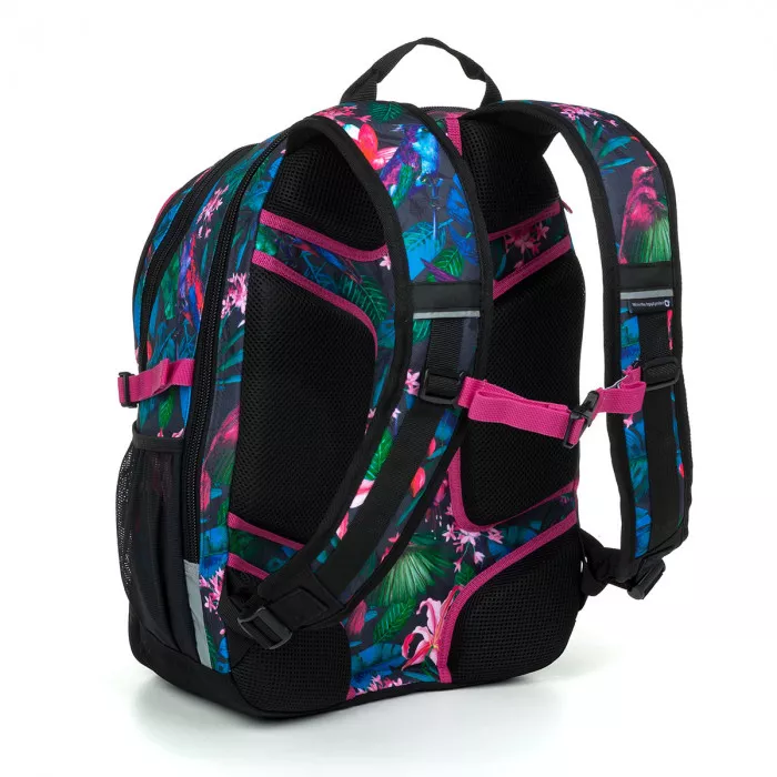 Studentský batoh Topgal RUBI 19030 G. Dvoukomorový studentský batoh, dvě objemné komory a dvě kapsy. Vhodný pro 2. stupeň ZŠ, SŠ, ale klidně i VŠ. Pevná záda a tvarované hrudní popruhy. Pozor! Nový studentský batoh s třpytivým materiálem na přední kapse a záplavou květin je tu. Jak se vám líbí? My si ho zamilovali hned na první pohled. Ideálně poslouží slečnám od druhého stupně ZŠ a výš. Klidně se hodí i pro starší studentky gymnázií a vysokých škol. Ty ocení polstrovanou kapsu na notebook v zadní hluboké komoře batohu. Do kapsy se vejde laptop až do velikosti 15,4" a navíc určitě využijete i menší našitou polstrovanou kapsičku, která je super na uložení tabletu nebo čehokoliv, co potřebujete mít jako v bavlnce. Pokud do školy notebook nepotřebujete, můžete kapsu využít třeba na sešity. Zadní komora je nejširší a nejobjemnější. Přední komora je pak užší, uvnitř je menší síťová kapsička na zip na drobnosti, které nechcete, aby se v batohu mezi učením toulaly. Na přední straně batohu se nacházejí dvě kapsy. Jedna hluboká, v horní části zdobená třpytivou látkou, a druhá menší pod nápisem HEY! Obě se zavírají na zip. Dbáme i na bezpečnost a zdraví studentek. Zádům dívek odlehčí pevná, anatomicky tvarovaná a polstrovaná zádová část batohu, kterou doplňují výškově nastavitelné, ergonomicky tvarované ramenní popruhy a hrudní dopnutí. Batoh jsme také vybavili řadou decentně umístěných reflexních prvků. Batoh má po obou bocích síťovou kapsu. Do jedné z nich pohodlně umístíte i velkou PET lahev s pitím, kterou utáhnete popruhem tak, aby nevypadávala. Další bonusy: hrudní přezka pro správné rozložení váhy, pevné a nepropustné dno z materiálu TOPDURA, pogumované taháčky a ucho na přenášení batohu v ruce, impregnace povrchu chránící proti dešti.